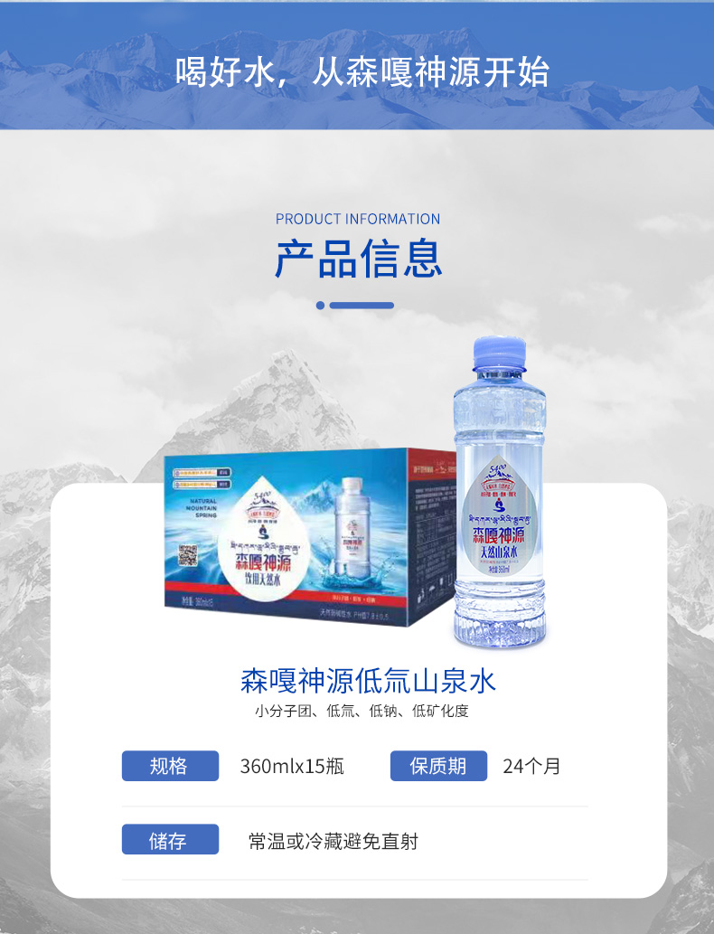 商品名称:森嘎神源天然甘甜山泉水360mlx15瓶*4箱 小分子 低钠 低氘