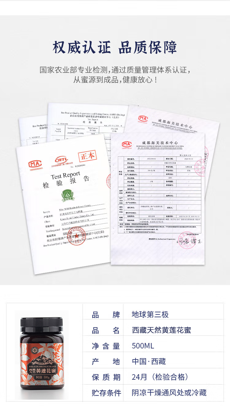 商品名称:地球第三极西藏野生黄连花蜜(家庭装)500g/瓶